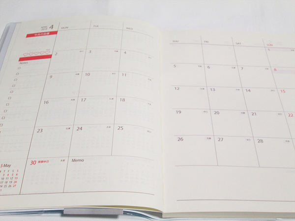 月間にも週間にもメモスペースが用意されているのでTODOなどの整理にも便利ですね(*´ω`*)