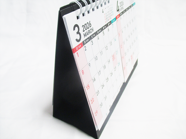 このカレンダーの最大の魅力は、やはり2ヶ月表示ができる点です。手前の月と次の月のカレンダーが一度に視界に入るため、先の予定を立てたり、スケジュールを調整したりする際に非常に便利です。また、曜日の列や土日祝日がカラーで色分けされており見た目にも分かりやすいため、一目で日付けを把握できます。さらに、ダブルリング形式でめくるのが簡単なので、ストレスなく次の月に進むことができます。