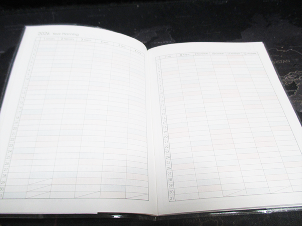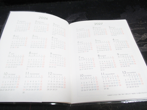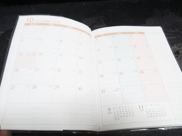 このダイアリーはまだ使っていないので、同型の今年のダイアリー(2025年度版)の使い心地についてお話しします。私はこのタイプのマンスリー手帳を一年間使ってきましたが、そのシンプルさがとても気に入っています。ウィークリーページがない分、薄くてコンパクトで、かさばらないのが本当に助かりました。仕事の予定やプライベートの予定をざっくりと把握するのに最適で、急な予定の変更もすぐに書き直すことができます。シンプルながらも、必要な情報がまとまっているので、とても使いやすかったです。