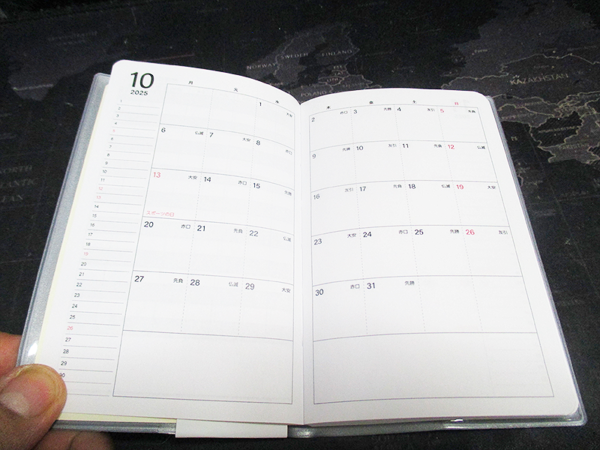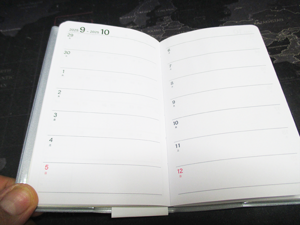 私は普段から、スケジュール管理だけでなく、日々のちょっとしたメモやタスクを書き留めることが多いです。そのため、コンパクトでありながらも、書き込むスペースがしっかりと確保されている手帳を求めていました。購入時期は9月はじめでしたが、店頭でこの手帳を見つけたとき、まさに理想的な形だと感じました。マンスリーとウィークリーのページが分かれていることで、それぞれの用途に合わせて使い分けができる点に魅力を感じました。また、A6スリムというサイズ感は、バッグの中でもかさばらず、持ち運びに便利で、外出時はこれを使えばかさばらないというのも大きな決め手となりました。
