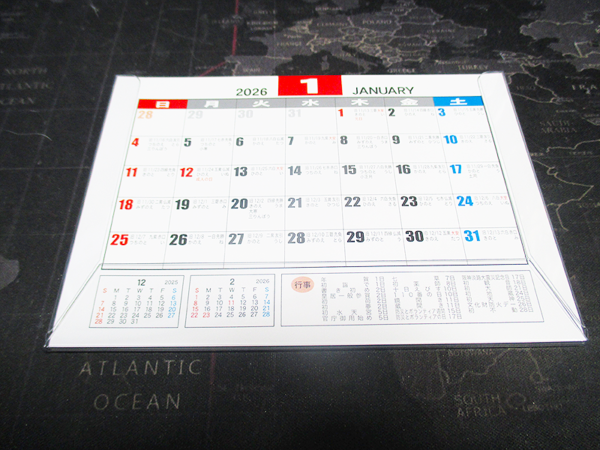 このカレンダーの最大の魅力は、そのシンプルな見た目からは想像できないほどの使い勝手の良さです。まず、卓上、壁掛けもできる2WAYカレンダーという点が非常に便利です。デスクではスタンドにして使い、壁に掛ける際はそのままフックにかけられるので、場所を選びません。また、ベーシックな作りながらもしっかりとした作りなので、一年間使い続けてもへたれる心配がありません。見た目はシンプルですが、細かな配慮が感じられます。例えば、月ごとの行事も記載されており便利です。祝日だけでなく、季節のイベントなども書かれているので、予定を立てる際に役立ちます。そして、メインの日付の横には先月翌月も小さいながらも月ごとに掲載されており確認するのに便利なのも、地味に嬉しいポイントです。