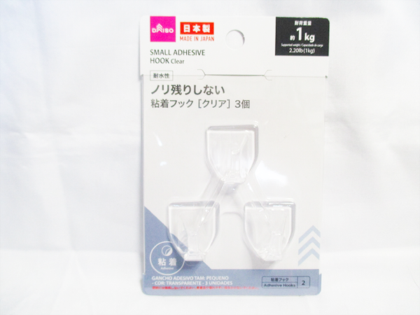 そのため、今回は「のり残りしない」という表記が必須条件でした。このフックは、パッケージにその旨が明記されており、しかもクリア素材で目立たないため、インテリアの邪魔にならないと判断しました。また、耐荷重1キロというスペックも、鍵やアクセサリー、小さな掃除道具など、ちょっとしたもの、よく使うものをひっかけておくのに便利なフックとして十分すぎると感じ、ダイソーにて購入を決めました。