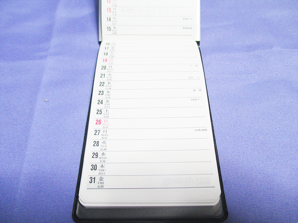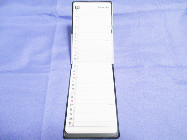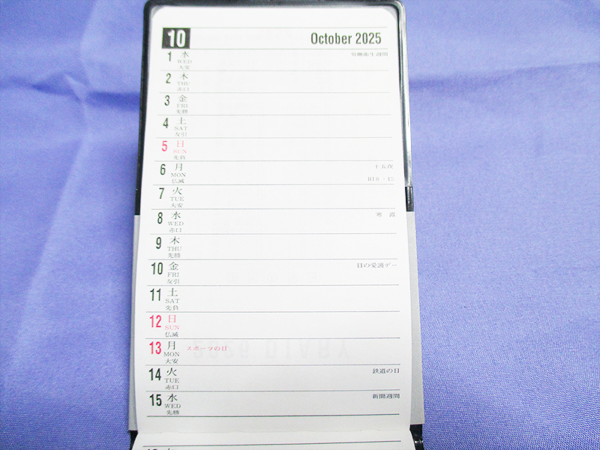 このダイアリーは、スーパーポケットサイズという手のひらに収まる絶妙なサイズ感でありながら、中身のフォーマットが特徴的でした。一般的な横型ではなく、月曜から日曜までが縦一列に並ぶ縦に使う形式になっており、一日あたりの記入スペースが「一行メモ」に特化しているのが新鮮でした。この「一行メモ」のフォーマットこそ、私が個人的にはその日の「これだけはやる」リストに使いたいと考えていた用途に完璧に合致すると感じ、ダイソーにて購入を決めました。