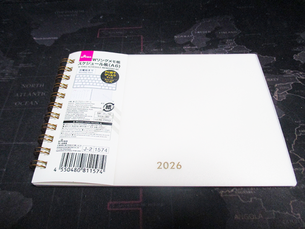 新しい年を迎える準備として、スケジュール帳はデスク周りの必需品ですが、PC作業をしていると、どうしても手帳を置くスペースに困ることがありますよね。そんなデスクワーカーの悩みを解決してくれる、画期的な形状のダイアリーを購入時期は9月中旬にダイソーにて購入しました。それが、今回ご紹介する**「2026年度 Wリングメモ帳 スケジュール帳(A6)」**です。