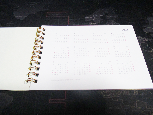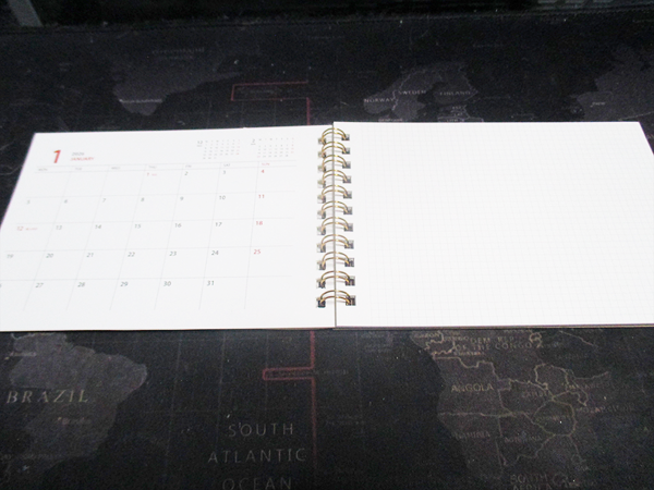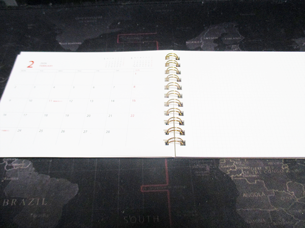 手帳の構成は年間カレンダー、見開きマンスリーとシンプルですが、ただのカレンダーではありません。特筆すべきは、見開きの左側がカレンダー、右側が方眼メモになっていて書き込むスペースが多い点です。左側のマンスリーで予定をざっくり把握し、右側のメモページにはその月のタスクリストや打ち合わせのメモ、アイデアなどを集約できます。この「カレンダー+メモ」が一体化していることで、スケジュールとそれに付随する情報を一元管理できるのが非常に便利です。A6横サイズで使いやすいため、筆記の際にも安定感があり、リング式なのでページを折り返して使える点も高評価です。