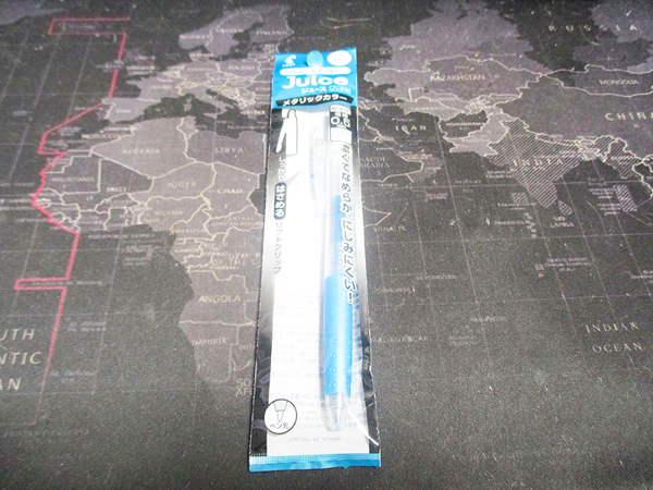 ダイソーで購入した「JUICE ゲルインキボールペン メタリックブルー」のレビューをお届けします。