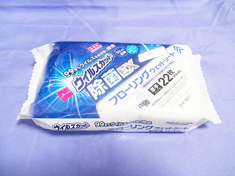 私がこの商品を選んだ一番の理由は、手軽にしっかりとした「除菌」を行いたいと考えたからです。最近では床のベタつきを落とすだけでなく、目に見えない菌やウィルスに対しても配慮された掃除グッズが増えていますが、ダイソーのこのシートは「除菌、99%除菌」という心強い表示がなされていました。