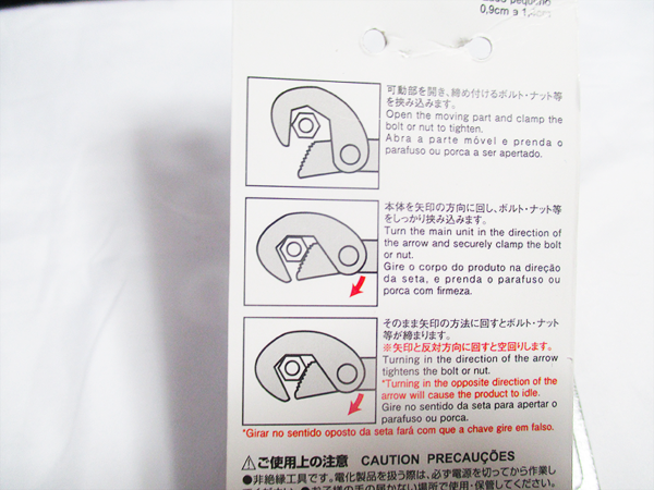 このアイテムが非常に便利なのは、その名の通り、サイズ調整が自動的に行われる自由度の高さにあります。ヘッド部分が特殊な形状になっており、挟み込むボルト、ナットを挟み込むだけで、そのサイズに合わせてガッチリとホールドしてくれます。