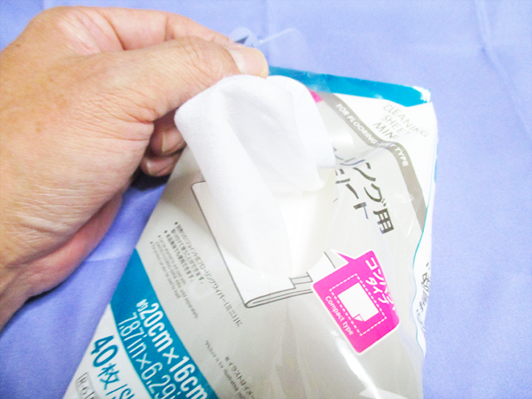 次に、その手軽さです。標準のウェットシートを使うまでもないちょっとした床掃除の際にとても便利で、例えば、キッチンで**(ちょっとお茶をこぼしたなど)**の小さなハプニングが起きたとき、大判シートを開けることなく、サッと一枚取り出して拭き取ることができます。