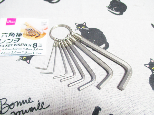 取り外しができないので全部つなげたままのはいただけないという構造上の弱点はありますが、とはいえなくしやすいので全部とまとまっていることには意味があるという紛失防止のメリットは非常に大きいです。8本組の六角棒レンチとして、日常のちょっとした「困った」を解決してくれる心強いお供として、ぜひダイソーの工具コーナーで探してみてください。