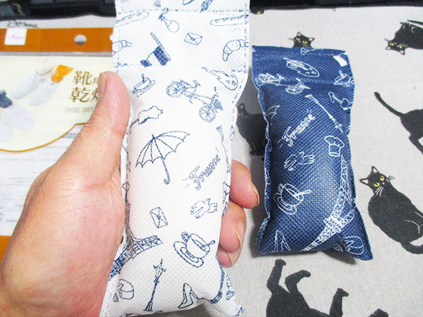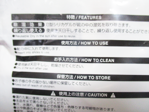 また、ペットを飼っている家庭ならではの注意点として、猫にいたずらされる危険性があるので気をつけたいという面があります。この乾燥剤は布製の袋に入っており、サイズ感も猫が遊びやすい大きさです。さらに欧米柄のプリントが興味を引くのか、出しっぱなしにしていると猫が前足でチョイチョイと転がしたり、どこかへ隠してしまったりすることがあります。シリカゲル自体は誤飲すると危険ですので、保管場所や使用中の靴の置き場所には十分な配慮が必要です。
