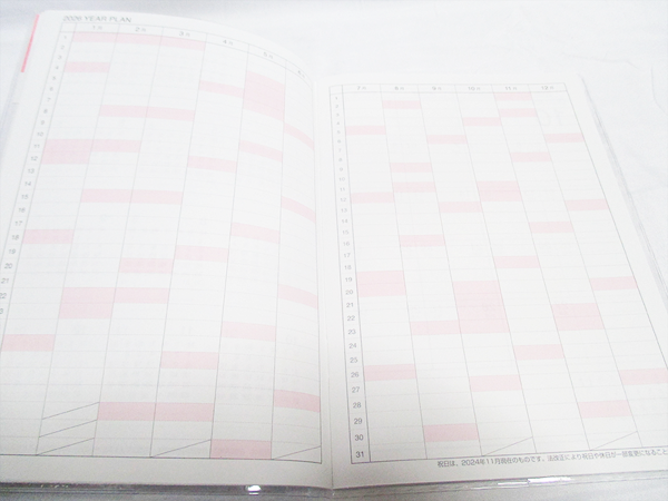 このダイアリーの最大の魅力は、そのシンプルな作りと機能性のバランスです。構成は年間カレンダー、見開き年間スケジュール、見開きマンスリーと、非常にシンプルで分かりやすいです。余計なページがなく、本当に必要なページだけが凝縮されています。また、見開きマンスリーは日付のマスが比較的大きく書き込みやすいので、その日の予定を書き込むのに便利です。家族の予定や仕事のシフトなど、色分けして書き込むことで、一目でスケジュール全体を把握することができます。シンプルながらも、必要なのは揃っているので、これ一冊でスケジュール管理は完璧です。そして、猫で癒やされるという、私にとっては何よりも重要なポイントもクリアしています。