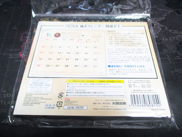 普段から100円ショップのキッチングッズや日用品にはお世話になっていますが、最近は文房具やカレンダーのラインナップの豊富さにも驚かされます。今回、ダイソーにてこの「2026 風水カレンダー」を見つけた時、そのシンプルなデザインと、月ごとに風水のアドバイスが書かれているという点に惹かれました。高価な風水グッズは手が出しにくいですが、たった100円(税抜)で日々の生活に風水を取り入れられるのは非常に魅力的です。購入した日付が8月下旬であり、一年を締めくくる時期ではないですが、来年を良い年にするため、早めに準備を始めることにしました。
