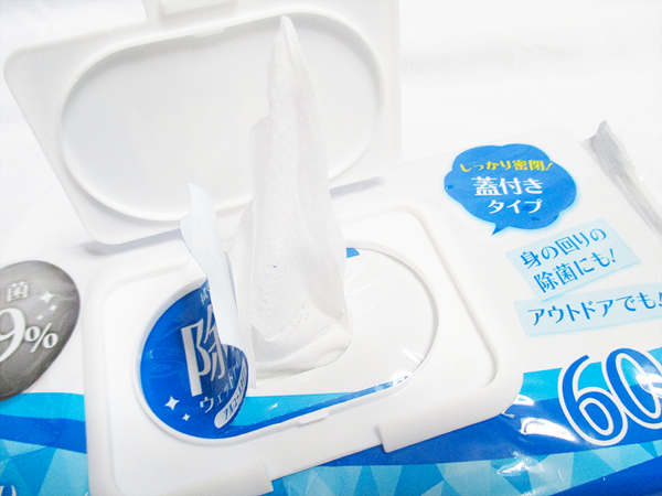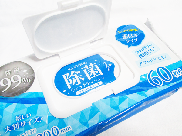 このウェットティッシュは、ローソンストア100にて購入できる商品ですが、価格は200円強の値段で100均ではないがしっかりした商品です。しかし、60枚入りで嬉しい多さであり、しかもサイズは大判タイプで20cm×20cmという大判サイズ。これなら、一枚で広範囲をしっかりと拭き取れると期待しました。さらに、パッケージの蓋つきでティッシュが乾くことをしっかり防いでくれる構造も、最後までしっかりとウェット感を保って使えるという安心感があり、購入を決めました。