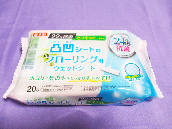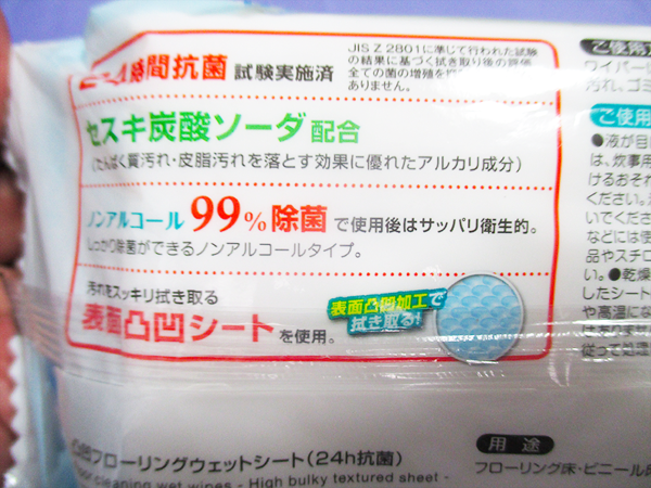 また、ただの平らな不織布ではなく、立体的なエンボス加工が施されている点も大きな決め手となりました。床に落ちた髪の毛や細かな塵を絡め取るには、シートの「引っ掛かり」が重要です。さらに、ノンアルコール、24時間抗菌、99%除菌という三拍子揃ったスペックを見て、これは単なる掃除用具の枠を超えた衛生管理アイテムだと確信しました。100円(税別)という価格でありながら、機能面で一切の妥協が感じられない姿勢に魅力を感じ、手に取りました。